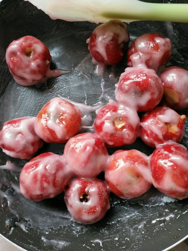 山楂倒入锅里,锅离火,翻炒,到糖冷却就可以了