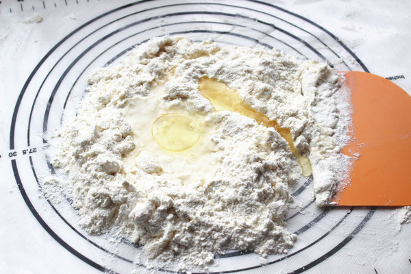 面粉和盐混合,堆在揉面垫上,中间整理出一个窝,倒入85度左右的开水