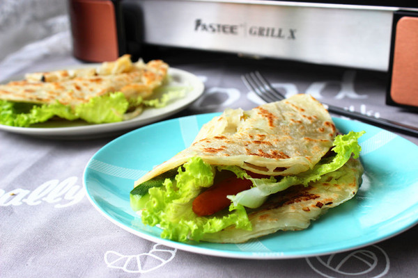烙好的饼,放上煎香的香肠,生菜叶,刷酱。