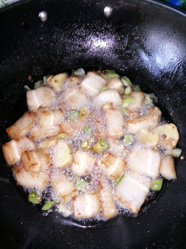 大火把水熬干后,关小火开始煎猪肉。放入葱和花椒,慢慢就会有猪油渗出。