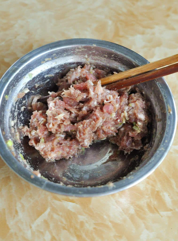 在肉馅里加入生抽、料酒、蚝油、盐,用筷子顺着一个方向搅拌,直到上劲,肉馅变粘。