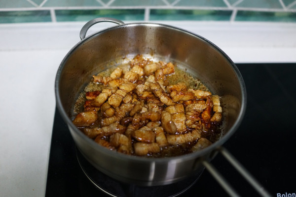 待冰糖的颜色变黄,就可以倒入切好的五花肉丁了。此时转大火,不停翻炒,炒到肉丁色泽金黄。