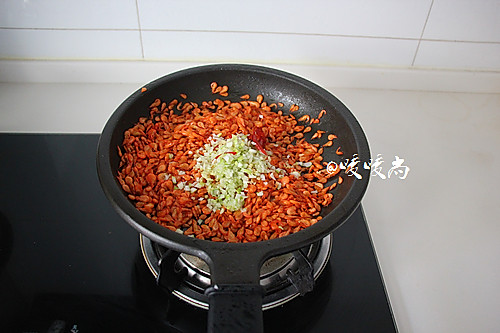 小河虾提前冲洗干净控水,平底锅内多放一些花生油,油热后下小河虾炒干水分、炒香。