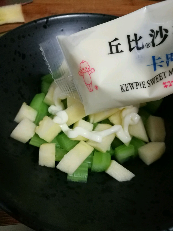 苹果去皮切丁,和西芹放一起拌入沙拉酱