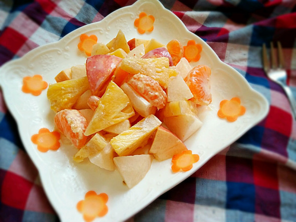 所有水果都切滚刀块,(切好水果后才发现家里没有沙拉酱了)用了千岛酱,味道超越沙拉酱。