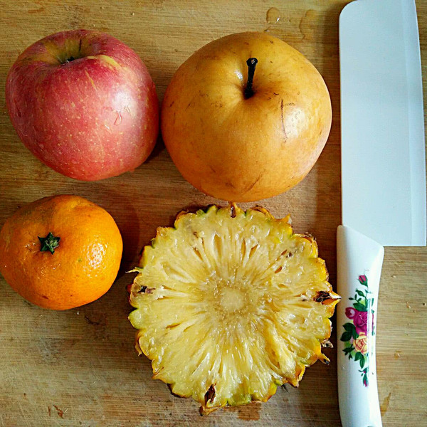 准备食材。(和上个菜谱中的香蕉西多士一起做的下午茶☕,所以这个水果沙拉中没有再加香蕉)有什么水果就用什么水果就好。