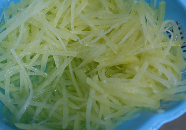 土豆去皮切成细丝,可以用刀切,也可以用擦丝器擦成丝;切好的土豆丝放在小盆里用清水冲洗两遍;