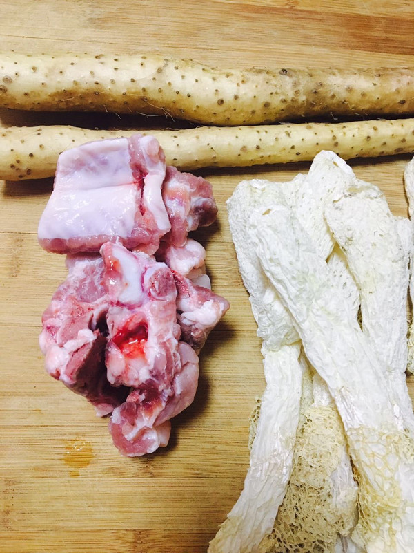 口蘑洗净切片,山药去皮切段,葱姜切段、片