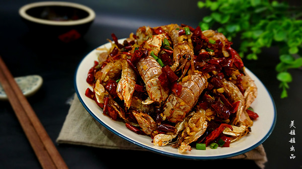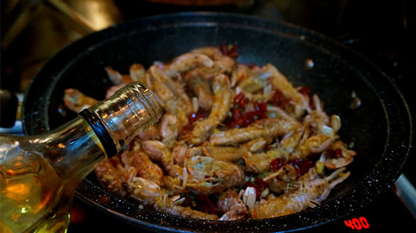 锅里上稍微多一点的油,烧至七成热,放入皮皮虾,大火炸一分钟左右转中火