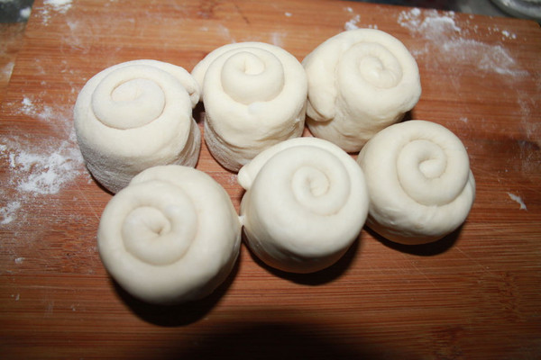 再取一个小蜗牛面团,从上向下压平,再用擀面杖擀成薄点儿的圆饼。