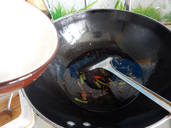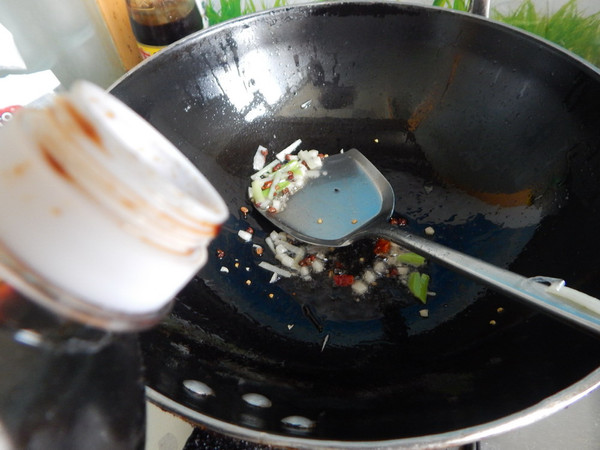 炸出香味在加入蒜泥葱末炒匀 ,炒匀后加入辣椒酱