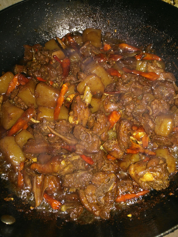 放入切好的磨竽翻炒均匀,加入啤酒两罐,焖至看不到啤酒汁出锅装盘。