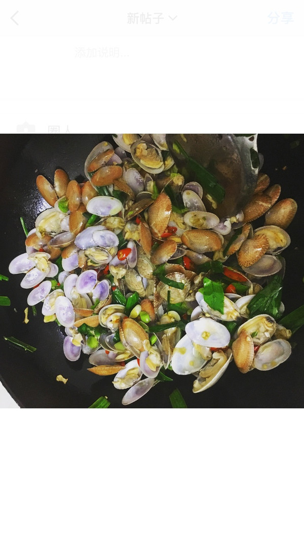 下入花甲炒一分钟左右,放入盐和生抽,勾一点芡粉兑水放入锅里收汁