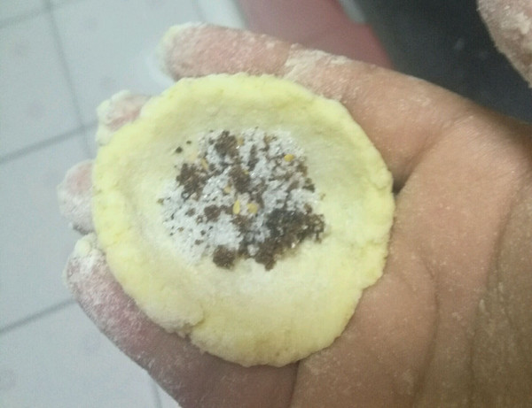 揪点面下来,用大拇指按成圆的,把馅包进来,封住口滚成圆的,也可以做成别的喜欢的形状。