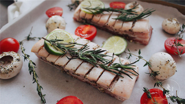 蔬果上稍微沾取些许刚才的调料,烤盘上放上一层油纸,加一些柠檬片和迷迭香。