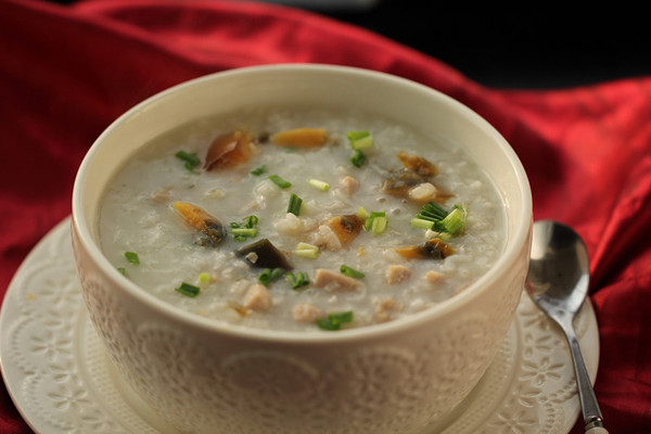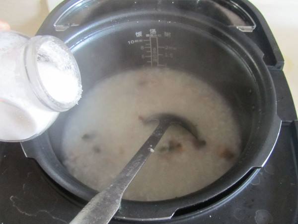 粥煮好了,按下大火收汁功能键, 揭开盖, 放入腌制的肉丁煮上一、两分钟;