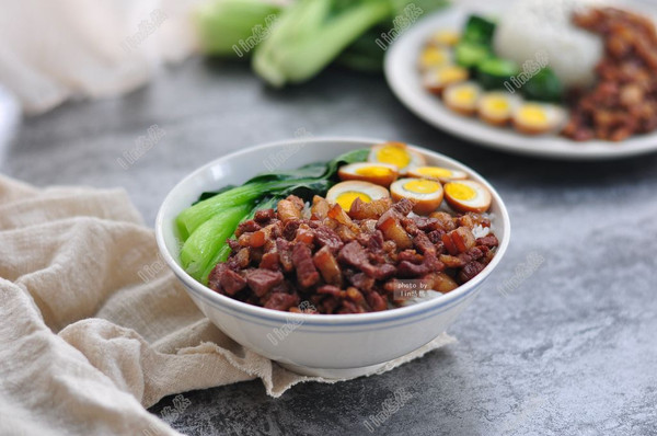 后二十分钟调入适量盐,放入煮熟的鹌鹑蛋一起卤煮,最后收汁,将大料拣出,所有食材放在米饭上,浇点卤肉的汤汁即可。