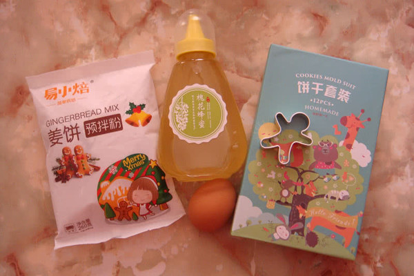 准备食材:姜饼预拌粉:260g,蜂蜜:65g,鸡蛋:60g。白巧(装饰用):1块,彩珠糖(装饰用):少许,姜饼人模具:1个