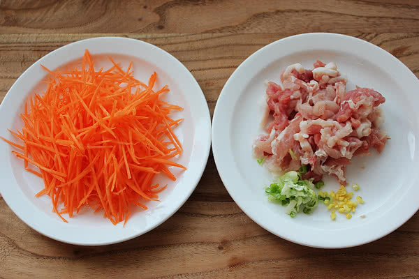 胡萝卜擦丝、猪肉切丝、葱姜剁碎