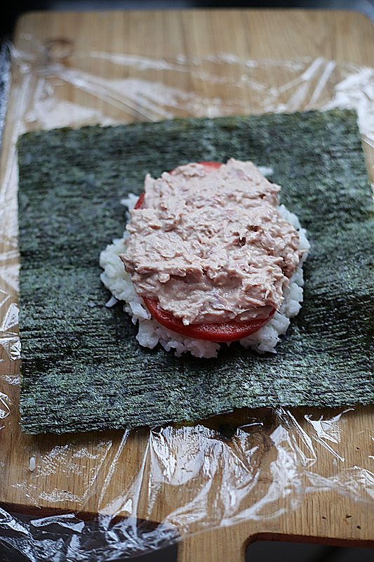 平铺保鲜膜,把整张海苔放在保鲜膜上(保鲜膜要大于海苔面积)。在海苔上铺上一层白米饭放上两片西红柿,加入金枪鱼沙拉,再加一层白米饭。
