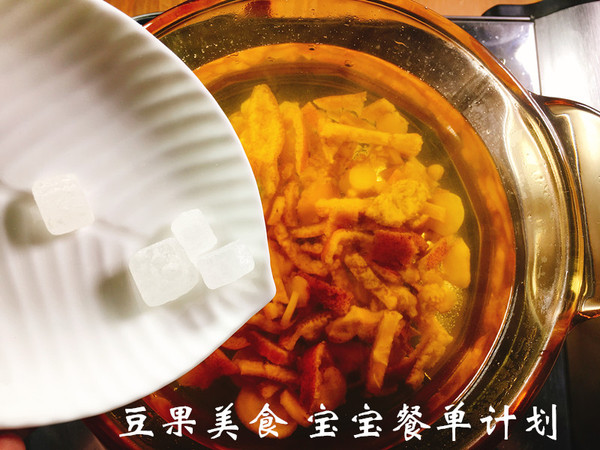 小火慢煮20分钟,关火前投入冰糖待温热取汁饮用。