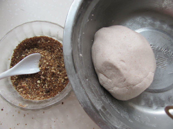 砸好的花生末用红糖拌匀,黏高粱面加水和成团。