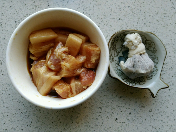 花椒跟八角用小纱布袋包起来扎紧口,这样炖完菜方便取出来,五花肉加适量生抽酱油腌制入味。