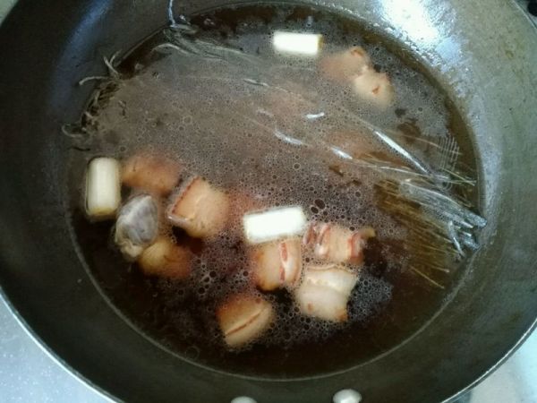 锅里加足量清水,放入洗净的粉条,调料包,一小勺料酒,最后加适量酱油,如果喜欢深色可以再加一点老抽调色,大火烧开后转小火炖15分钟左右。如果是粗粉条再适当多炖一会。
