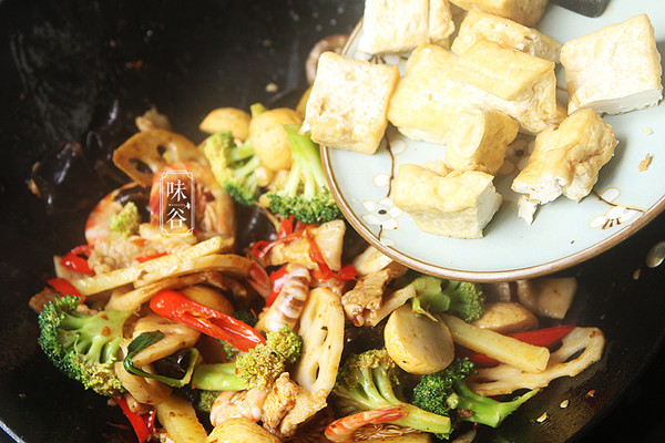 倒入所有焯熟的蔬菜和鱼丸翻炒均匀。