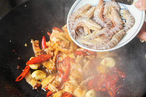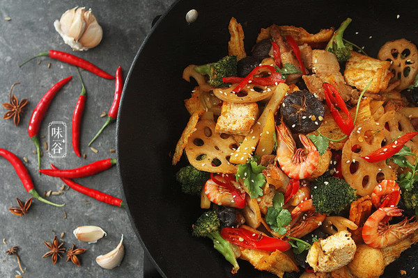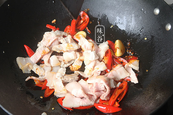 锅内放入油,比平时炒菜要多点,下辣椒和蒜瓣爆香。