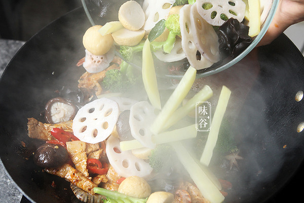 把莲藕、马铃薯、西蓝花、香菇、鱼丸放锅内加清水,水开后滚3,4分钟,焯至8成熟,捞起沥干水备用。