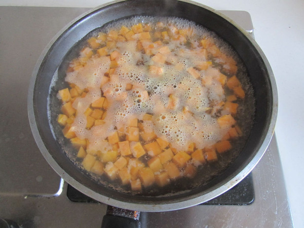 再将红薯丁放入里面焯煮至七、八成熟, 焯好后沥干水分;
