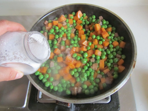 肉丁翻炒变色后加入红薯丁进去翻炒;