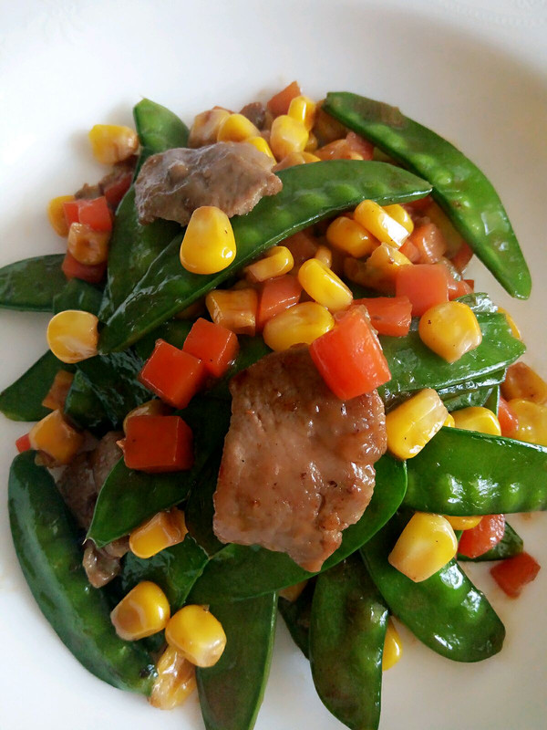 热锅凉油,放葱花肉片煸炒,放入玉米粒,荷兰豆,放盐,鸡精(一点点),放胡萝卜,翻炒(记住哦,很容易炒熟),装盘