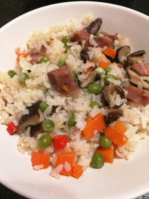 腊肠,胡萝卜,香菇,辣椒,香葱,切丁,豌豆洗净,备用。份量根据实际情况把握,个人认为比米饭多,好吃。
