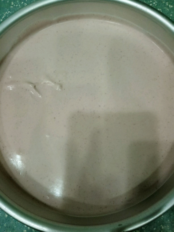 再将余下的草莓慕斯倒在戚风蛋糕上抹平,放冰箱冷藏5小时,最好是冷藏过夜。