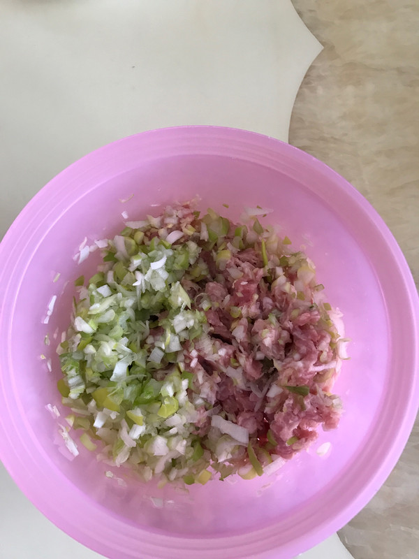 猪肉馅朝着一个方向搅拌上筋,边搅拌边加入葱姜水。