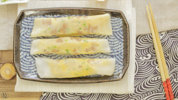 移出平盘,用刮板等工具将肠粉卷起,完成主要部分的制作。