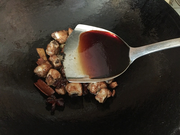 调入酱油翻炒均匀(酱油很浓颜色很深不能放多了,不然排骨烧出来颜色太黑不漂亮了)