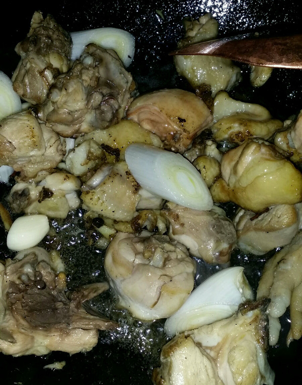 加入鸡块、葱姜蒜、料酒炒10分钟