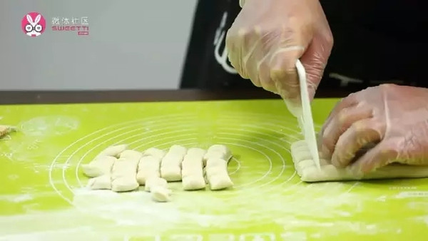 面团搓成条状,用刮刀切成小剂子(5g/个),均匀撒上面粉使其散开不粘。