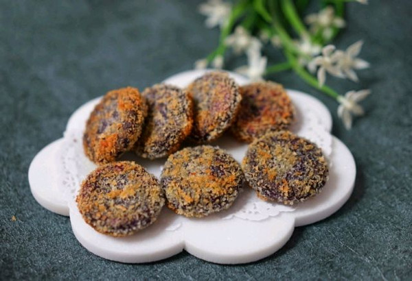 紫薯球压扁拖蛋液,裹面包糠后入平底锅煎至两面金黄