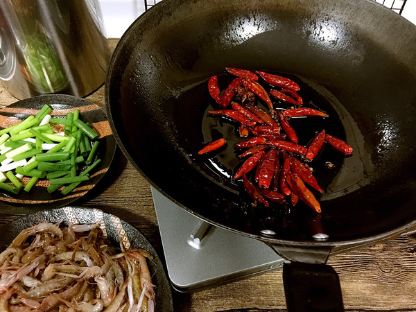 嘎巴虾冲洗干净,空出多余的水;干红椒清洗一下,拭干表面水分;蒜剥皮,姜切片,小葱切段。