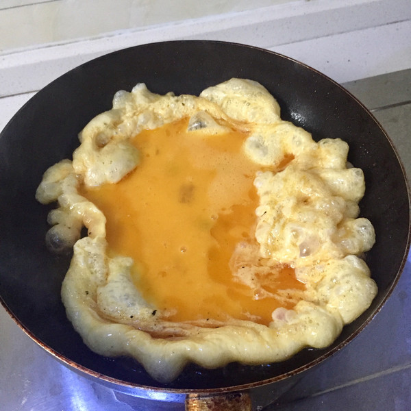 锅里倒入植物油烧热后倒入蛋液,快速炒散至熟即可(用芝麻油炒鸡蛋最为松软)