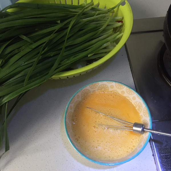 制作馅料:韭菜洗净,沥干水分,鸡蛋放适量盐和胡椒打散备用