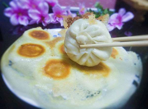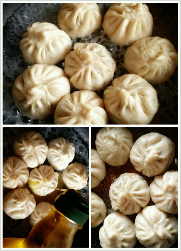 准备淀粉水,煎锅放入适量油,把包子摆入煎锅里,每个之间要有距离。把包子底部煎成黄色,底部变硬。