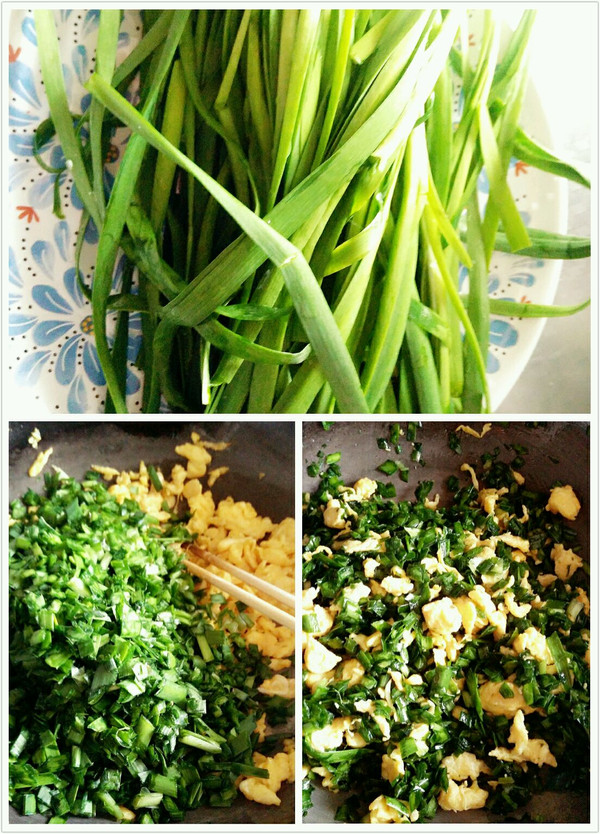 韭菜洗净,切碎,和鸡蛋拌在一起,加入适量盐和香油。拌匀。