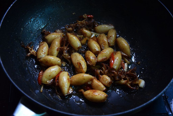 再倒入鱿鱼一起翻炒,加入剩下的酱汁炒匀