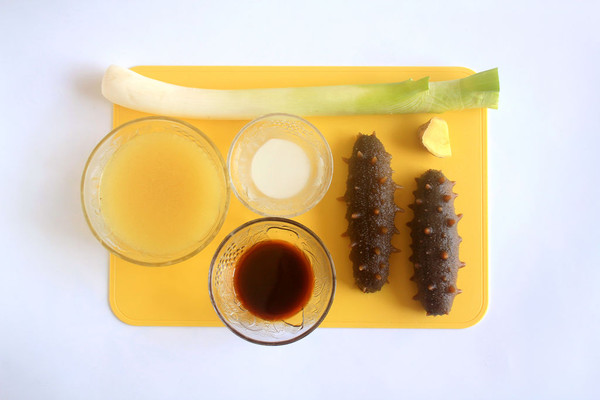 干海参泡发(泡发细节请参考本日第二篇菜谱)。酱油、蚝油、料酒调和成生酱汁,淀粉加少许清水调成水淀粉。高汤则是用鸡骨和猪骨熬制的汤底,如果不想麻烦可以用浓汤宝来替代,但调味的盐份就需要酌量减少。因为海参自身没有什么味道,要靠高汤来煨制入味,所以不建议用清水来取代。