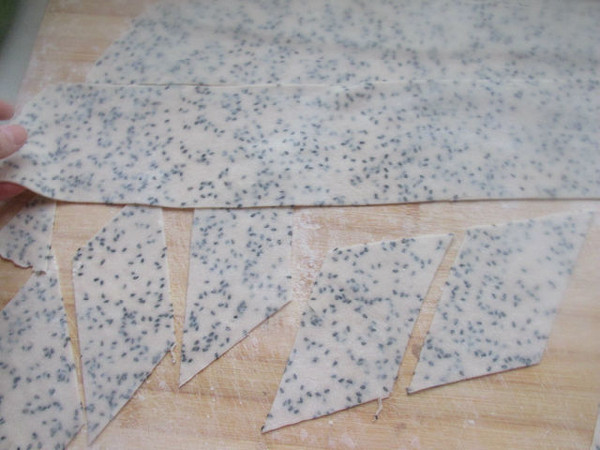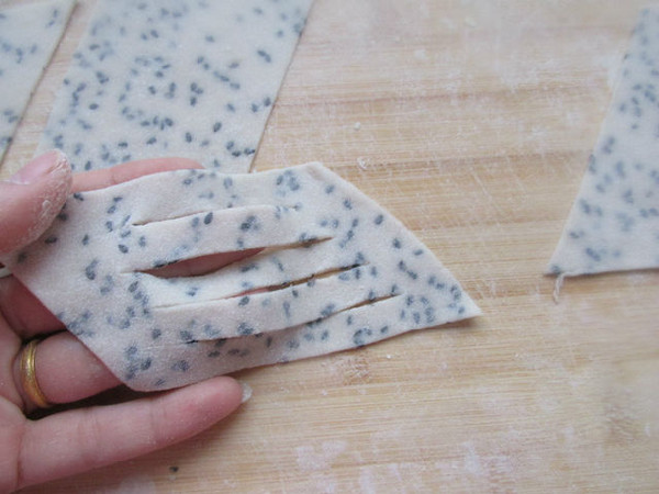 用擀面杖擀开成薄片,一定要薄一点,切成宽条,再切菱形。